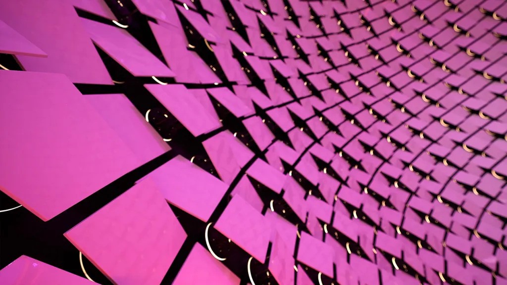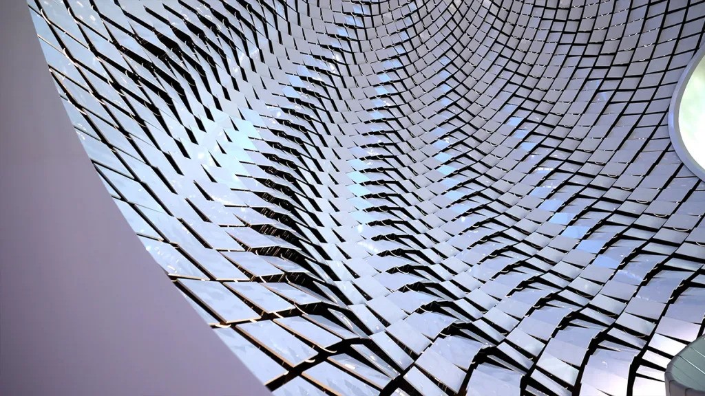 Devised by the Brooklyn-based new media artist studio Breakfast, the Pearl sculpture is over 13.7 metres in height, has a diameter of 16 metres, and is composed of nearly 3,000 computer-driven kinetic tiles.