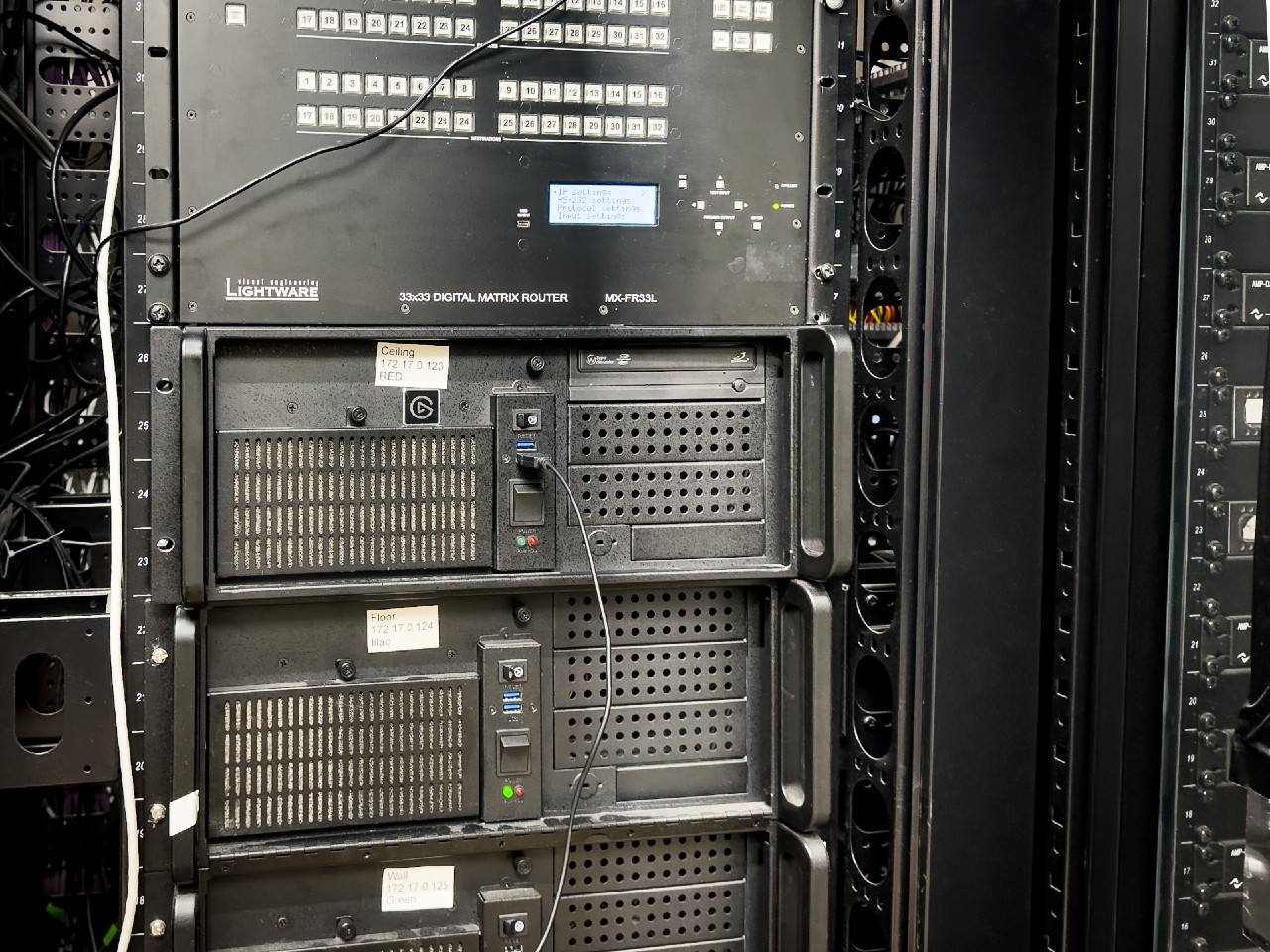 All loudspeakers feature a coaxial design to allow an accurate and unusually wide off-axis response. The Dante backbone and the acoustically transparent projection screens allow speakers to be added when required.